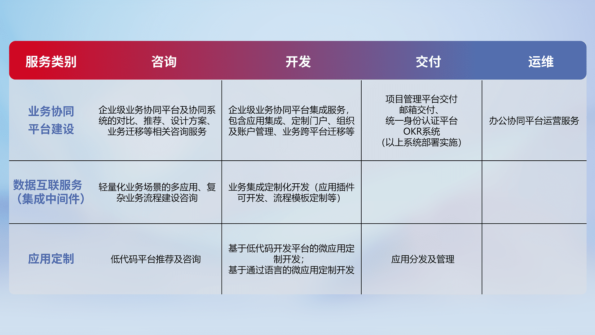 针对钉钉、、、企微、、IDaas等平台级产品提供产品的规划、、、方案、、交付、、定制化开发等服务,,,,实现如统一协同办公、、、智能客户服务、、混合会议管理、、、智能数据查询、、等业务场景,,,实现数字化转型。。。